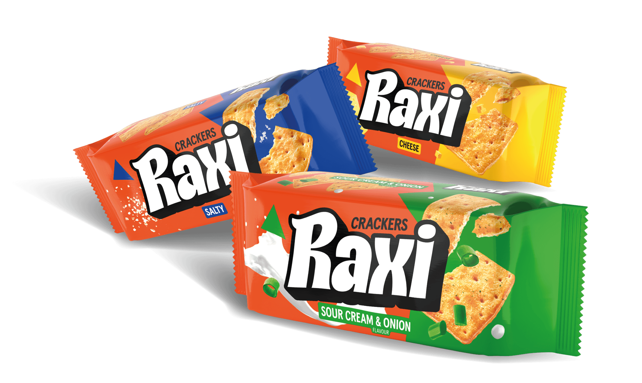 The “RAXI” assortment is crafted to satisfy a wide range of tastes: Salty, Cheese, Sour Cream & Onion, and Smoky Bacon. It includes two cracker sizes and four packaging types, one bag for mini crackers and three flowpack formats for regular-size crackers.